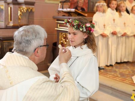 Am Sonntag, 12. Mai haben in Lommis in einem festlichen Gottesdienst 10 Erstkommunion-Kinder zum ersten Mal das Geheimnis des Heiligen Eucharistischen Brotes empfangen. Mit viel Herz sind die Erstkommunikanten durch ihre Katechetin Diana De Simone auf diesen grossen Moment vorbereitet worden.