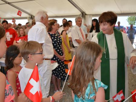 Pfarrerin Christa Heyd, welche am Nationalfeiertag immer wieder Geheimnisse zu lüften weiss, wie etwa dasjenige auf dem Fünfliber „Christus providebit“, hat auch dieses Jahr in ihrem Predigtwort Herzen berührt und zum Nachdenken angeregt. Sie sprach davon, dass der Mensch Verwurzelung brauche. Sie berief sich auf ein Wort von Bundesrat Cassis, welcher darauf hingewiesen habe, dass die Globalisierung viele Bürger und Bürgerinnen verunsichere, und sie sich deshalb nach Zugehörigkeit sehnten. Das 170-Jahr-Jubiläum der Schweizerischen Bundesverfassung war für Christa Heyd wiederum Grund, Gott die Ehre zu erweisen und ihm zu danken für sein Wirken.