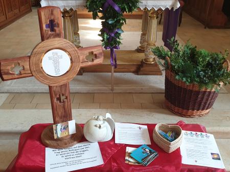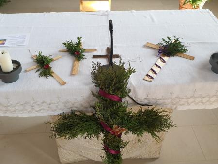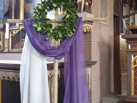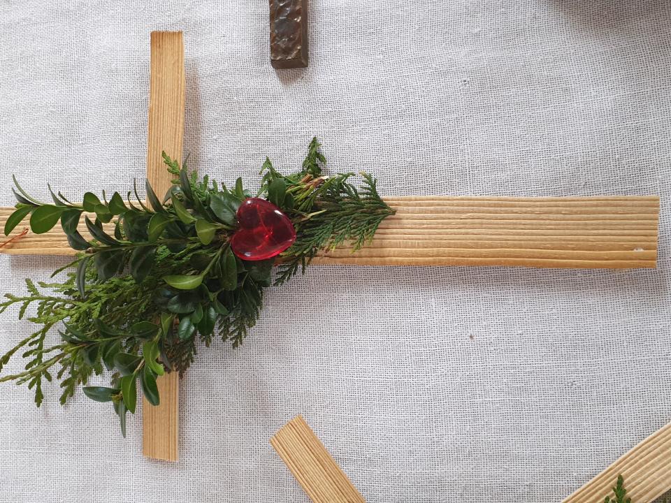 Auf diesem Kreuzweg tragen wir Glaubende die Palmkreuze voran. Sie sind zwar noch grün und scheinen voller Leben, doch die Kreuzesform weist uns schon hin auf den Karfreitag. Hier in der Todesstunde von Jesus, verliert der Lebensbaum jegliches Grün und wird zum kahlen Baum der Traurigkeit und des Todes.