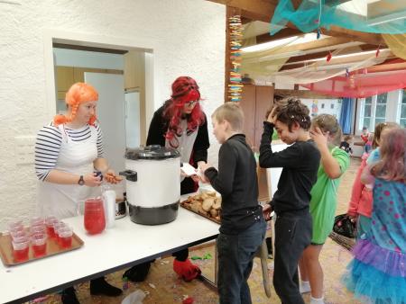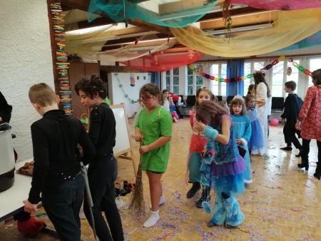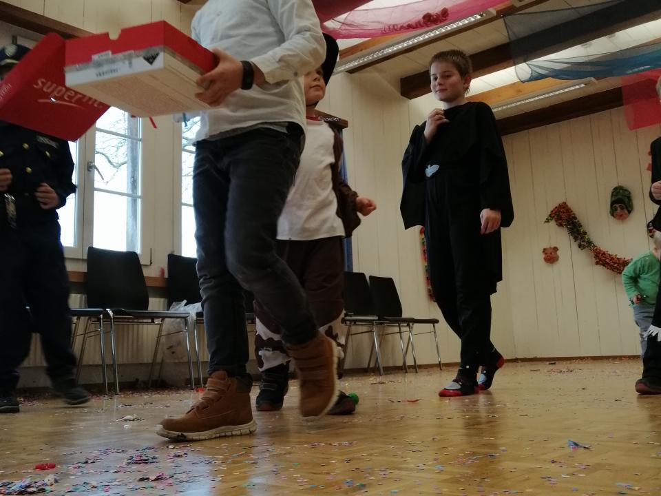 Die hübsch geschminkten und spektakulär verkleideten Kinder hatten noch lange nicht genug. Sie tanzten noch wie wild zu lauter Fasnachtsmusik. Immer mehr ging dann auch dem letzten Kind die Puste aus und wir begannen, gemeinsam aufzuräumen. Alle die konnten, nahmen einen Besen oder Lappen in die Hand und so begann die grosse Putzaktion. Denn gemeinsam sind wir stärker, besser und schneller.